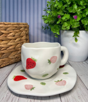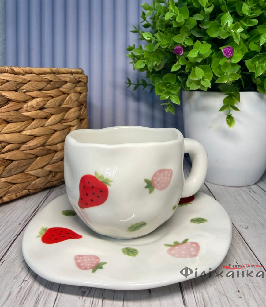 Блюдце, яке входить до комплекту, підкреслює загальну стилістику та робить набір ще практичнішим: воно захищає поверхні від крапель, створює охайний сервізний вигляд і додає елегантності подачі напою. Разом вони утворюють гармонійний та декоративний дует, який стане чудовим подарунком для близьких або приємним доповненням домашнього посуду. Набір «Суниця-Полуниця» 300 мл приносить у дім затишок, свіжість і яскраву нотку літа.