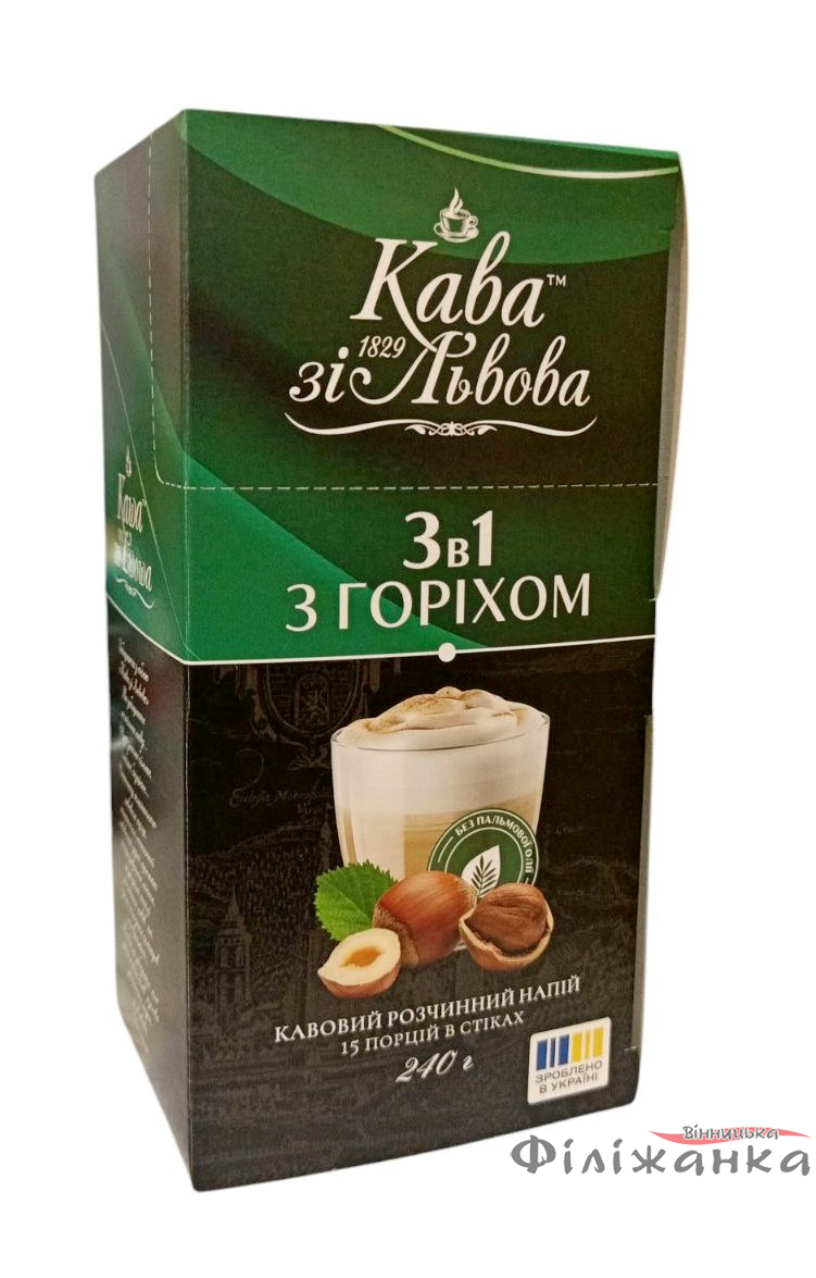 Кавовий напій Кава зі Львова 3в1 З горіхом добре бадьорить, заряджає енергією і дарує гарний настрій. Вдома, на роботі, в дорозі чи гостях — зручний формат і порційна упаковка дозволяють насолоджуватися улюбленим смаком, де б ви не знаходилися!