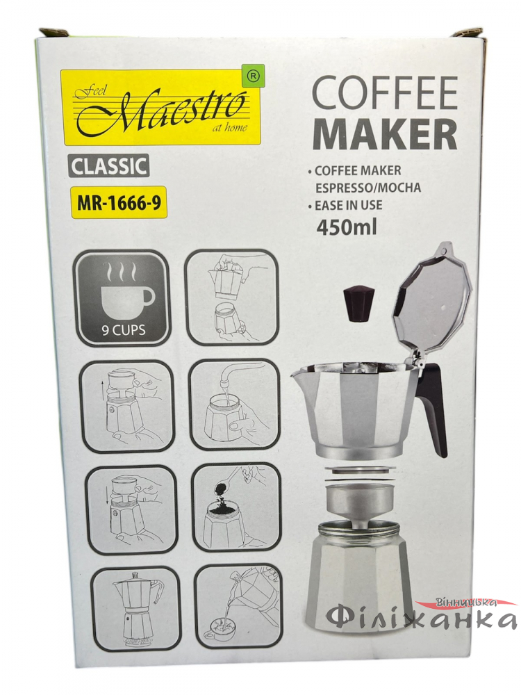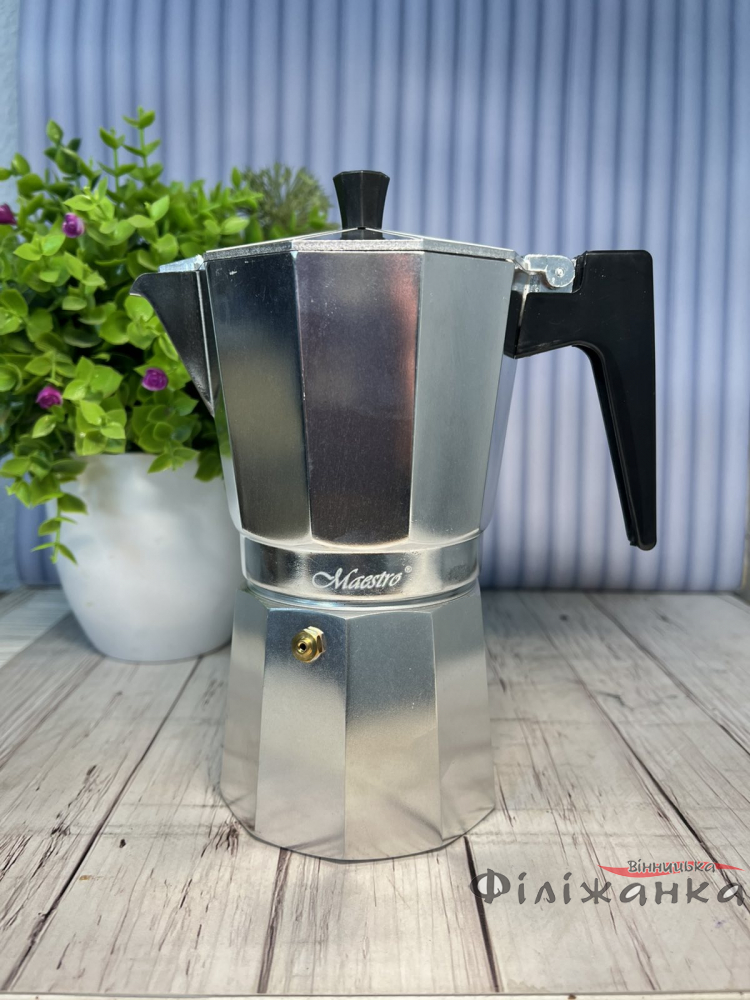 Гейзерна кавоварка Maestro 450мл "Espresso Moka" 1666-9 алюмінієва поєднує в собі якість, зручність та стиль . Цей кухонний пристрій стане вашим незамінним помічником у приготуванні смачного еспресо, який подарує вам заряд бадьорості на весь день.