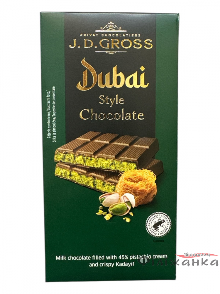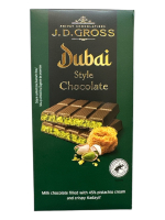 Дозвольте собі здійснити незабутню смакову подорож з "Дубайським шоколадом J.D.Gross Дубай з фісташковим кремом та хрустким Кадаїфом". Цей вишуканий десерт вагою 122 грами від відомого виробника J.D.Gross покликаний перенести вас у світ східних казок, поєднуючи в собі ніжність та надзвичайну текстуру.