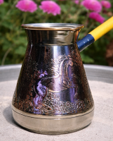 Турка мідна ЧП Сторчай Кінь 500 мл - високоякісна карбована модель вітчизняного виробництва з сучасним дизайном, товстим дном та міцним корпусом. Зроблена з імпортної міді, для запобігання окислення внутрішні стінки оброблені лудінням, зовнішні - надійним захисним покриттям з нікелю. Широкий уловлювач піни дозволить зберегти чистоту плитки під час заварювання, а дерев'яна ручка захистить від опіків.